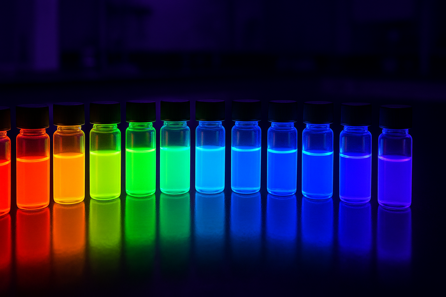 tiny semiconductor dots that fluoresce under UV light. each color = a different wavelength response.